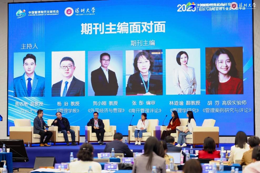 会议于22日上午正式开幕,深圳大学副董事长巢乃鹏教授致欢迎辞。随后,西交利物浦大学席酉民教授、浙江大学魏江教授、清华大学罗家德教授等知名学者分别围绕数智化背景下的组织网络化、数字战略架构、领导力与创新绩效等主题发表演讲。在“期刊主编面对面”环节中,《南开管理评论》《管理学报》《外国经济与管理》等高水平管理学期刊主编与编委,围绕“AI在论文写作与期刊投稿中的伦理”这一现实议题展开深入对话,引发了与会者对学术规范与技术创新关系的广泛思考。“靶子论文研讨”环节则聚焦前沿管理学案例与方法创新,南开大学白长虹教授、华中科技大学杨治教授、浙江工商大学陈衍泰教授分别报告了团队最新研究成果,内容涵盖创造型企业案例、高校成果转化冲突机制、人工智能与组织创造力等方向,为大会营造了高水平的学术交流氛围。