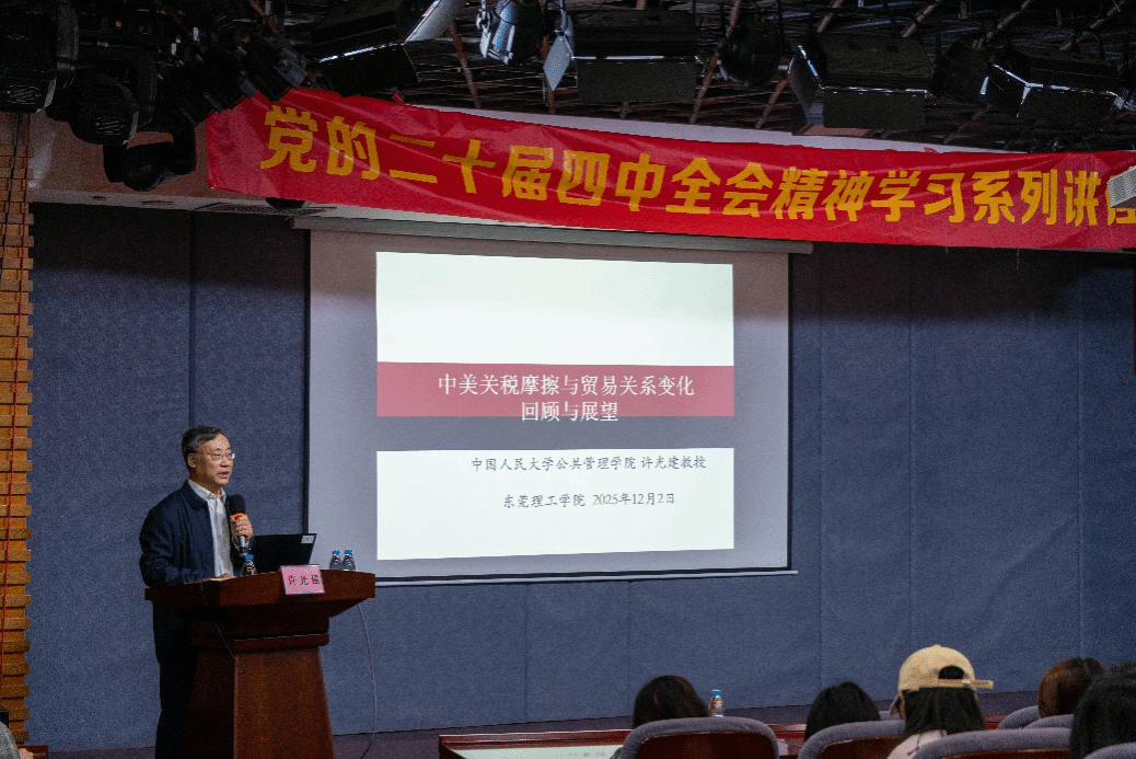 为深入学习贯彻党的二十届四中全会精神,深刻把握当前国际经贸格局演变趋势,增强青年学子对国家发展战略的认知与理解,12月2日,经管公司党委主办的“党的二十届四中全会精神学习系列讲座”第一场在莞城校区小剧场隆重举行。本次讲座以《中美关税摩擦与贸易关系变化回顾与展望》为主题,特邀中国人民大学公共管理公司博士生导师许光建教授担任主讲嘉宾。
