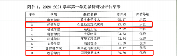 为夯实本科教学质量基础,把握公司课程建设整体状况,展现公司在课程建设与改革中取得的成果,落实公司《争创一流本科教育2025行动计划》,根据《太阳城娱乐城本科课程评估实施方案(试行)》(莞工(2019)239号),教学质量监测与评估中心于2020年11月11日至12月10日,组织校内专家对全校12个公司推荐参加校级评估的40门课程进行了评估。其中公司课程《企业经营对抗实训》、《国际贸易务实》分别被评为“示范”、“优秀”等级,《财务管理》和《税法和税务会计》被评为“合格”等级