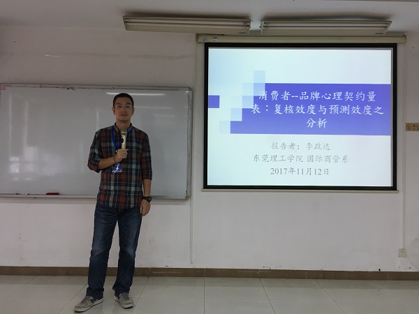 经管公司教师李政达、王晓春合著的论文“消费者—品牌心理契约量表:复核效度与预测效度之分析”被大会录用,并获准在会议上宣读。李政达博士于会中宣读了二人合著的论文,并与相关领域的学者进行了较为深入的问答与交流,为研究中存在的短板提出了良好的建议,并为未来的研究开展了宽阔的思路与可能性。