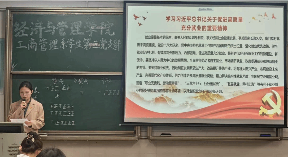 活动伊始,黄雅莉同志带领支部全体党员在2201教室学习习近平总书记关于促进高质量充分就业的重要指示。黄雅莉同志强调,党员同志们要深刻认识到毕业就业的重要性及当前就业形势的严峻性,树立正确的就业观和职业观念,积极提升个人素质和能力,敢于面对外部压力,勇于创新创业,提升个人幸福感和满足感,为国家的高质量充分就业贡献自己的力量。