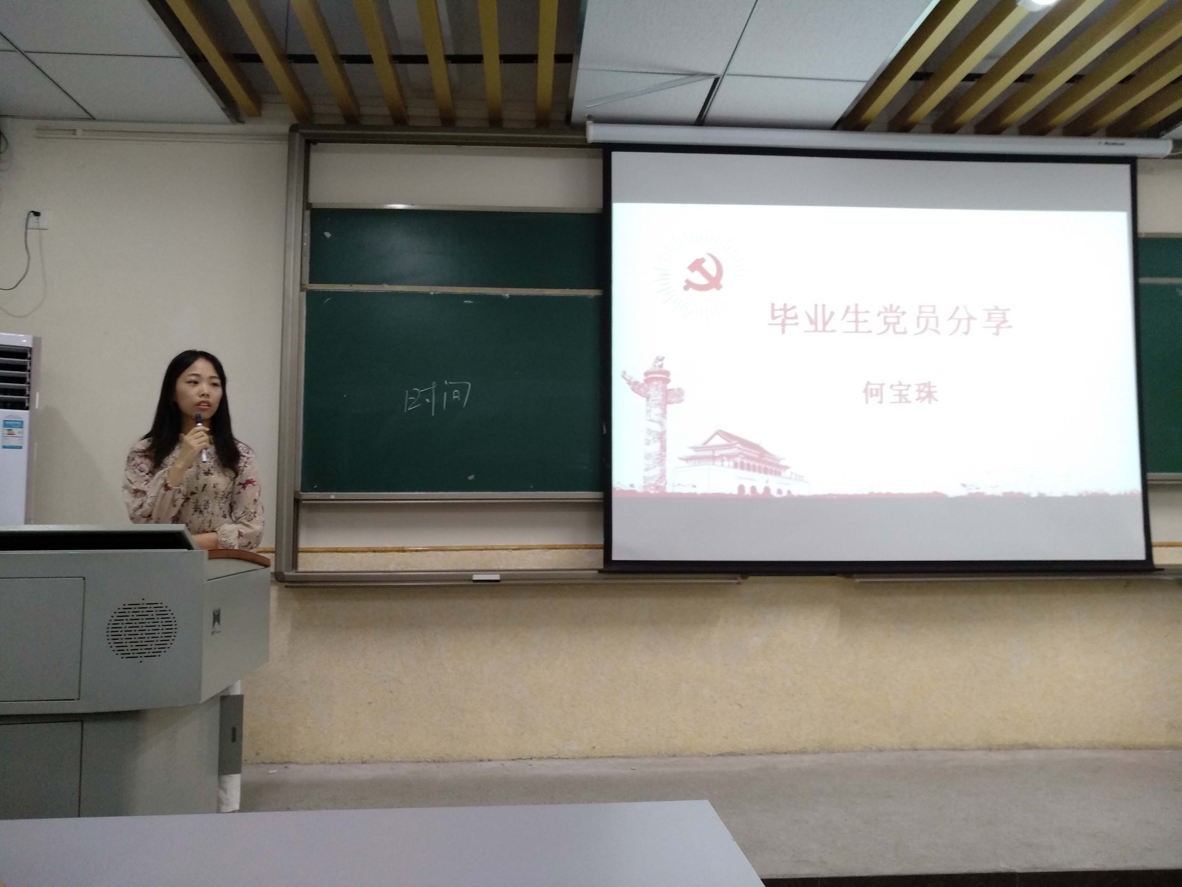 梁嘉琪同志分享如何利用大学时光严格要求自己成为一名合格的中共党员。她指出,作为一名员工党员,需要合理规划和定位大学目标,发挥党员的先进性,加倍努力掌握更多技能,同时不忘培养良好的生活、学习习惯,时刻保持党员积极向上的精神风貌。何宝珠同志学分享老员工如何做好就业选择,清楚归纳了国贸专业的基本就业范围,为迷茫的同学们指点迷津,充分发挥了优秀党员的模范作用。