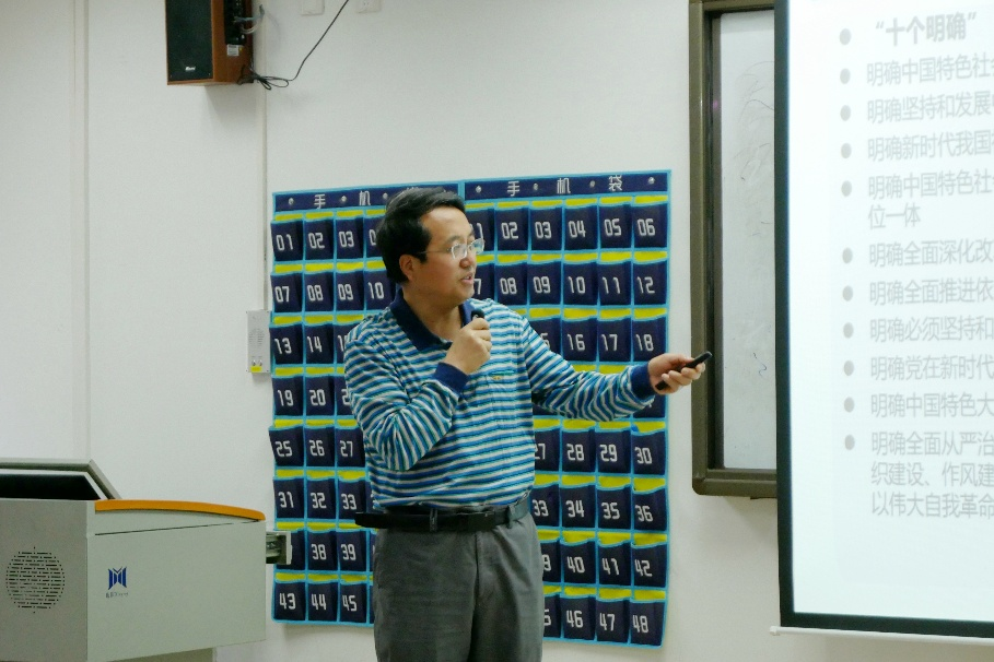 紧接着,他详细解读了习近平新时代中国特色社会主义思想中的“十个明确”、“十四个坚持”和“十三个方面成就”,并围绕法治建设、军队建设、全面从严治党等内容进行深度剖析,帮助员工加强对习近平新时代中国特色社会主义思想的认识。