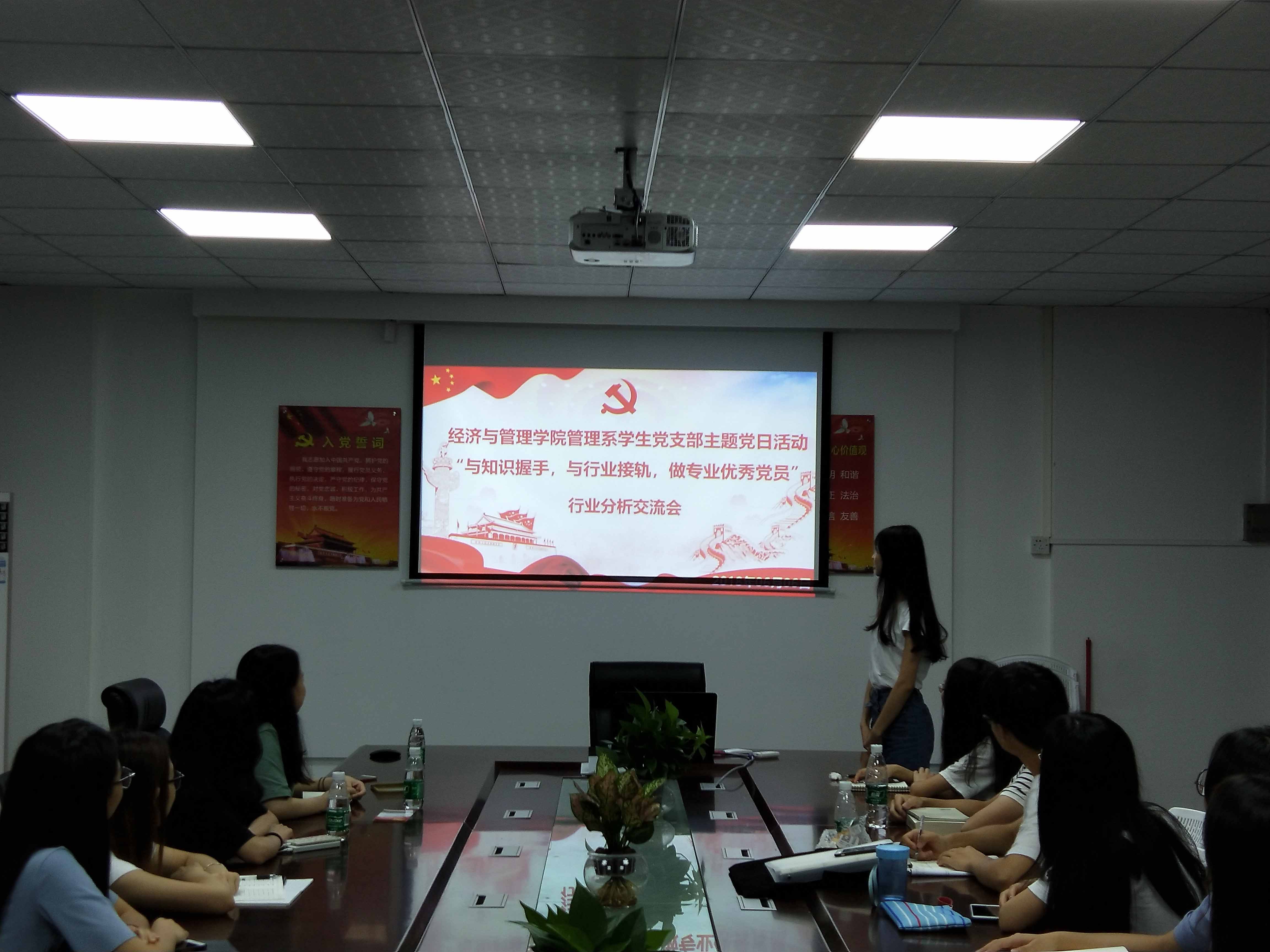 为深入学习贯彻党的十八大和习近平总书记系列重要讲话精神,推进“两学一做”学习教育常态化制度化,牢牢把握住加强党的先进性和纯洁性的建设主线, 6月6日晚上,太阳城管理系党支部于莞城校区3307课室开展了以“与知识握手,与行业接轨,做专业优秀党员”为主旨、以中国对外贸易行业为内容的行业分析交流会党日活动。本次会议由经济与管理党支部管理系党支部方秋凌主持,我系党支部全体员工党员参加了交流会。