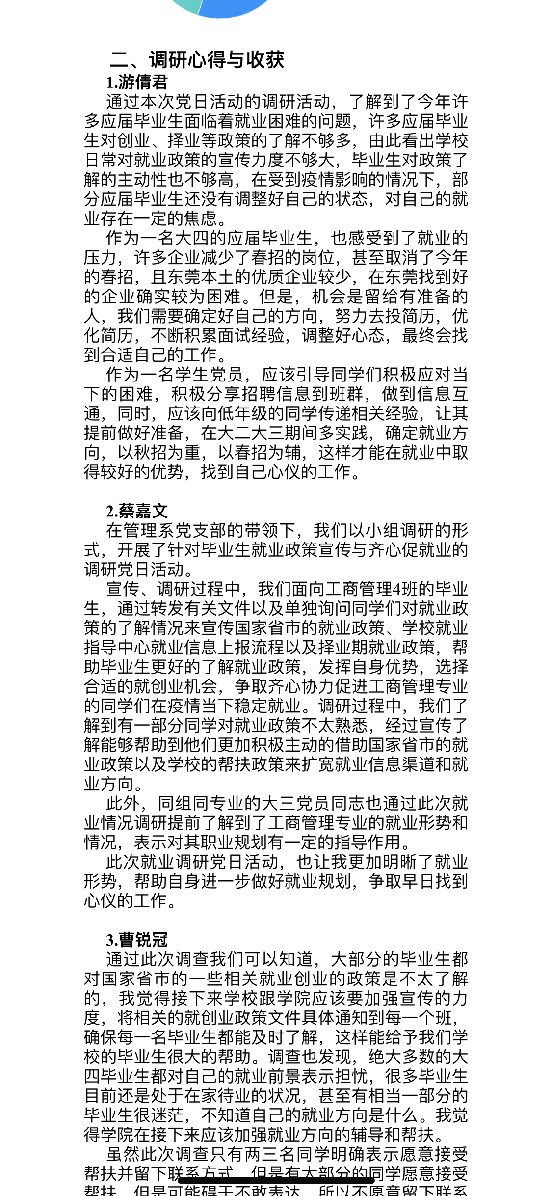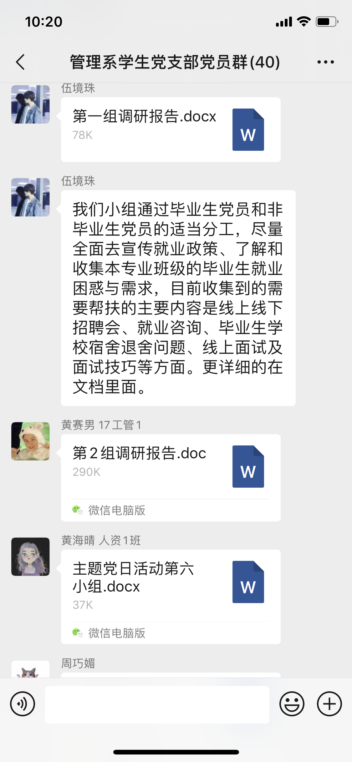 新冠肺炎疫情发生后,党中央、国务院高度重视和关心高校毕业生就业工作,要求多措并举做好就业工作。为让员工党员充分认识当前形势,了解毕业生求职就业的现状和问题,统筹推进疫情期间毕业生就业工作,4月17日下午,管理系员工党支部借助微信平台开展“疫情之下,齐心协力促就业”调研报告交流会,公司党委副书记黄湘及全体员工党员参与了此次活动。