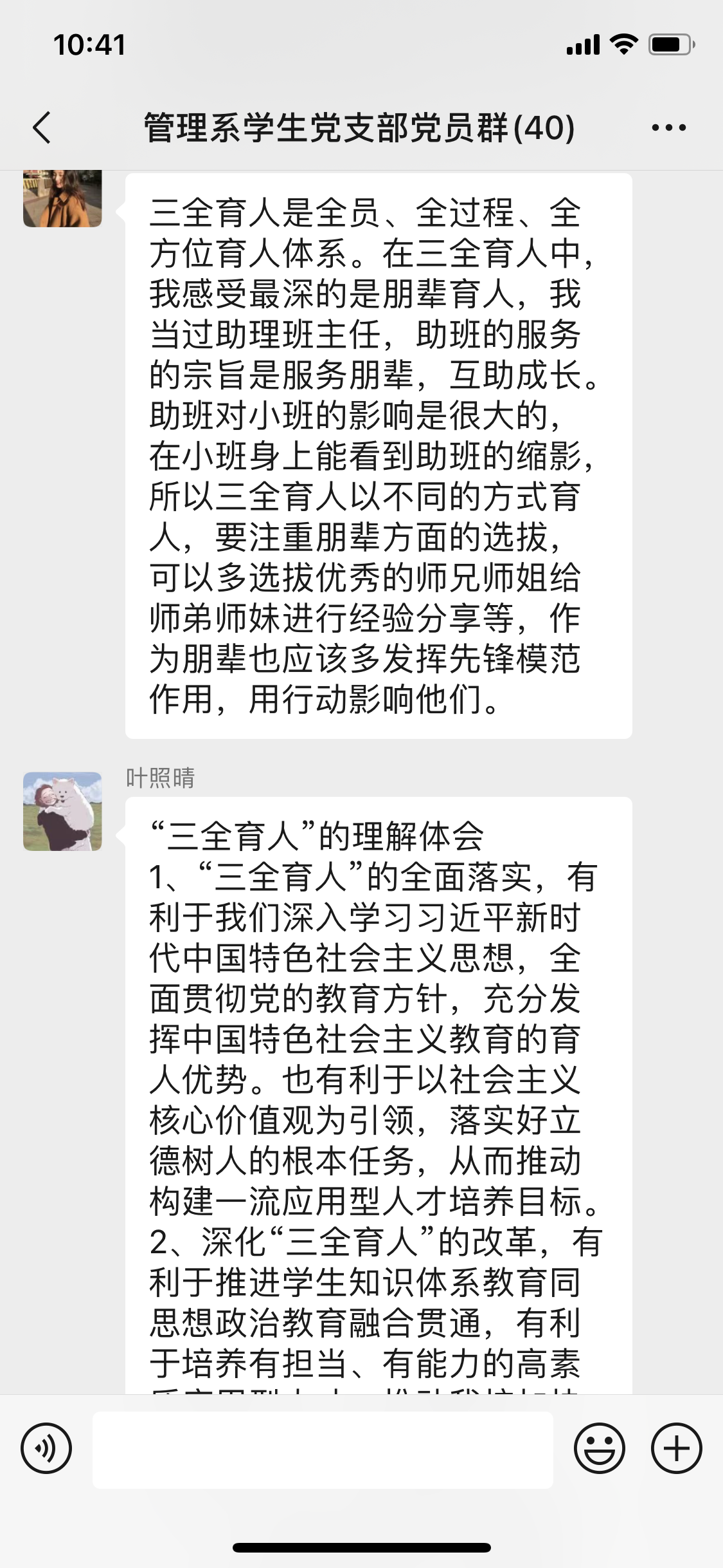党员们在深入学习领会习近平总书记关于教育的重要论述,探究“三全育人”的内涵和理论基础上,通过云端会议和云讨论的形式,结合自身实际,分享交流了自己对“三全育人”的理解和感受,并站在老师的角度,针对如何“育人”提出自己的想法,其中,黄学良同志表示“高校要从‘教’走向‘育’,作为老师要聚焦员工,因材施教,做到教书和育人兼顾。”党员们纷纷为公司、公司的发展建言献策,激发了党员们的创新创造活力,深化员工党员对“三全育人”的认识。