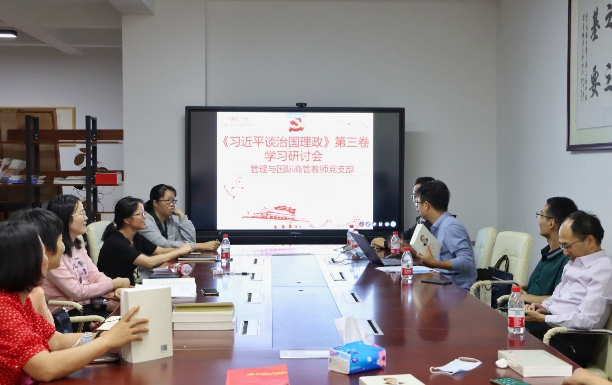 2020年10月8日,管理与国际商管教师党支部于莞城校区4420召开支部党员大会及开展《习近平谈治国理政》第三卷学习研讨会,引导支部党员全面掌握习近平新时代中国特色社会主义思想的科学理论体系,深刻领会习近平总书记教育重要论述。