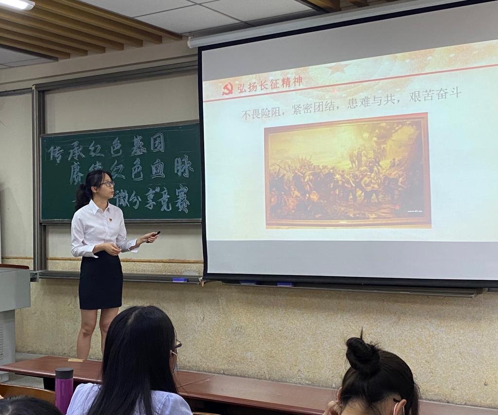 比赛中,黄海晴等同志的团队带领大家回顾红军长征路上的“军民一心,鱼水情深”,从历史发展的足迹中寻找军民鱼水情深的凭证。由现在富饶的生活条件反问“学习长征精神的意义”,通过回顾红军长征的历史,深度剖析红军长征精神,发出“延续红军长征精神”的倡议。