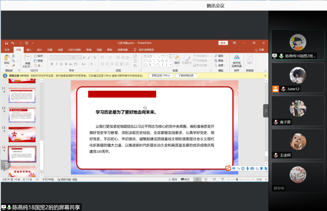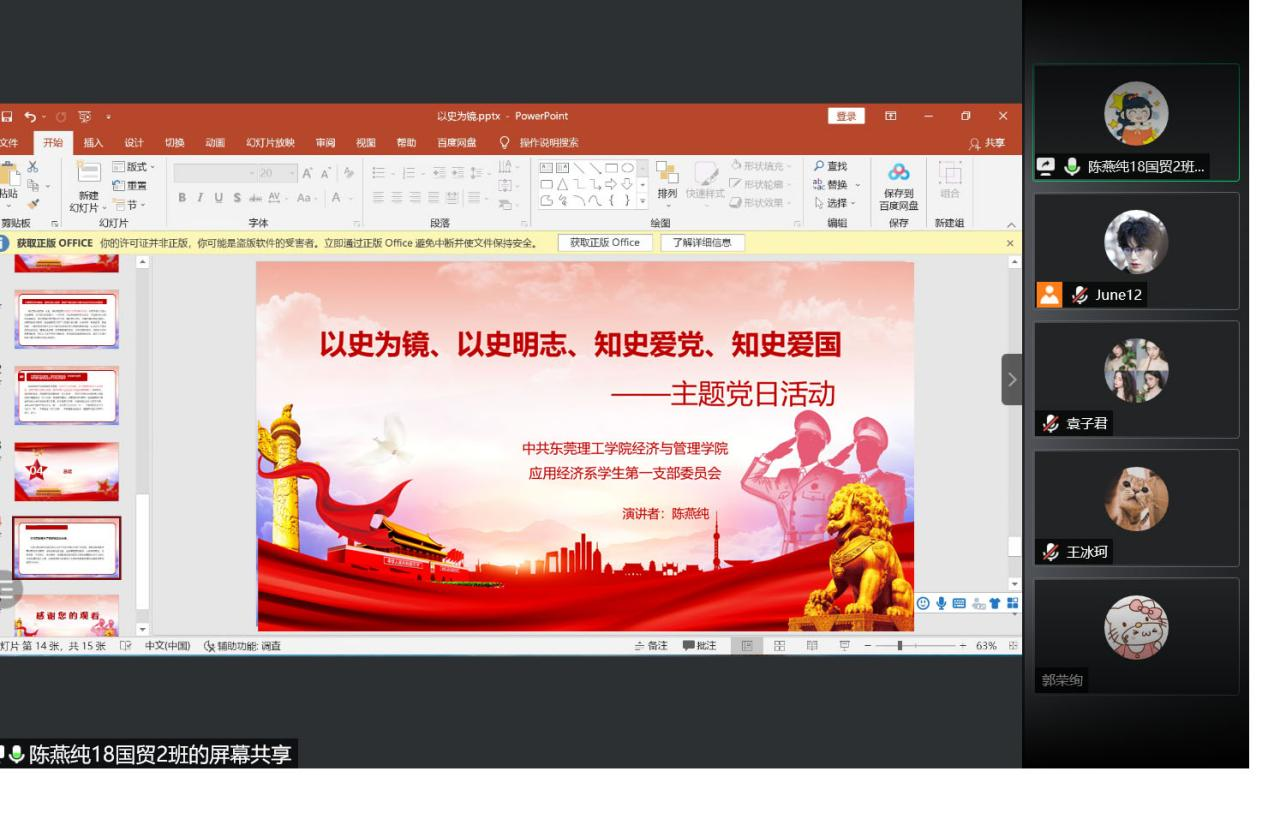 6月21日,太阳城应用经济系员工第一党支部组织学习贯彻习近平总书记重要文章《以史为镜、以史明志,知史爱党、知史爱国》线上主题党日。会议由支部书记付小全同志主持,全体党员参与了学习。
