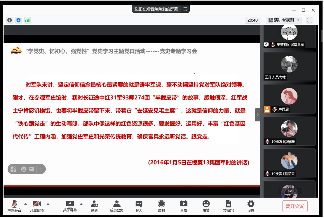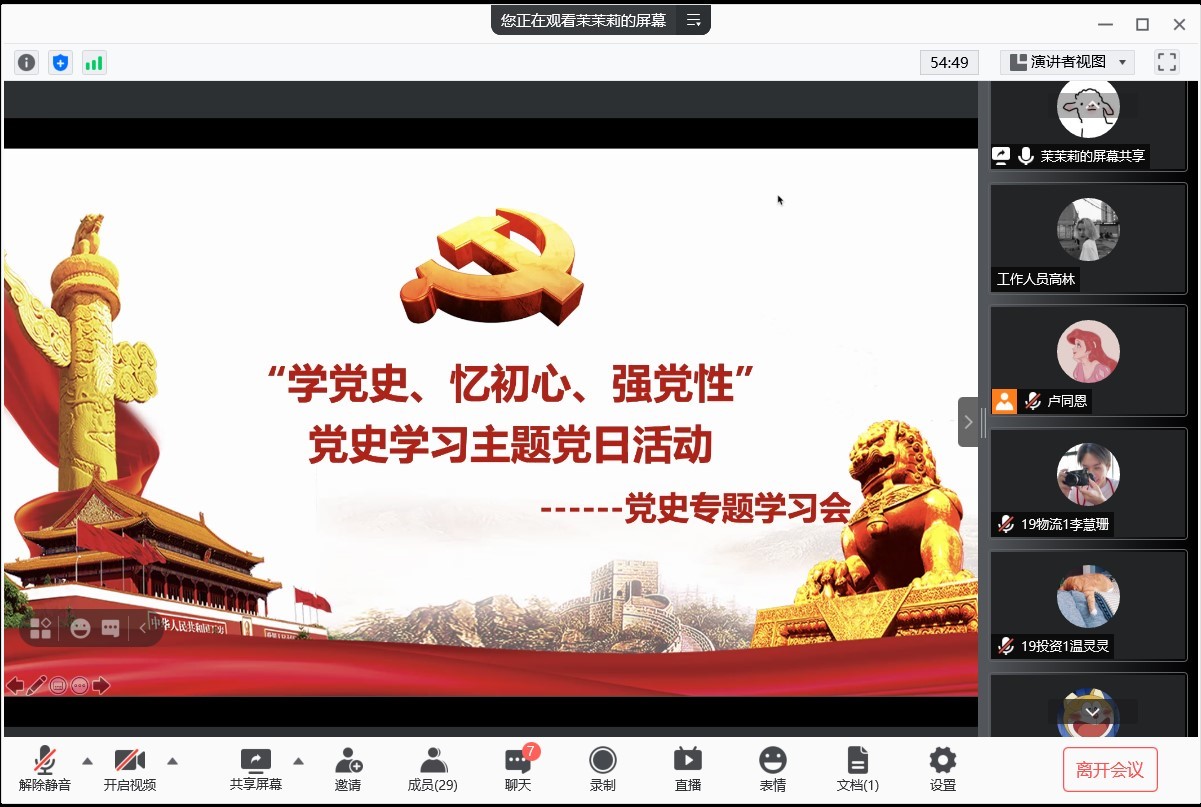 6月25日晚,经济与管理公司管理工程系员工党支部顺利开展“学党史,忆初心,强党性”线上主题党日,管理工程系员工党支部书记杨梅青、全体员工党员参与了本次党史专题学习。