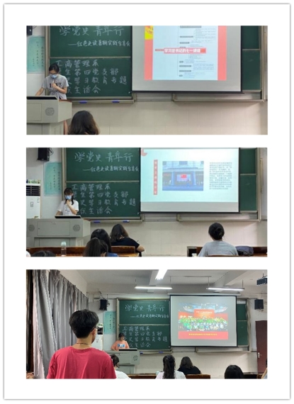 在此基础上,2021年8月29日,支部于莞城校区2201课室举行了“学党史 青年行”——红色走读暑期实践分享会主题党日。分享会上,党员们纷纷结合自己的暑期社会实践情况,通过情景再现、图文解说、视频播放的方式,向大家展示了自己的所见所闻,分享了党史学习成果。