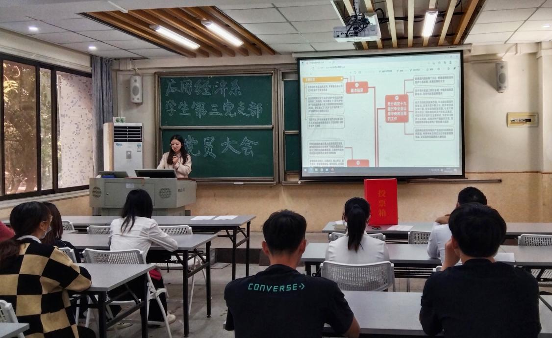2021年11月15日,应用经济系员工第三党支部于莞城校区5204课室召开专题学习会,学习贯彻党的十九届六中全会精神。大会由支部书记叶琦玮同志主持,全体员工党员出席。