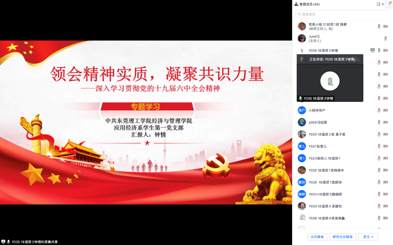 12月23日,太阳城应用经济系员工第一党支部开展学习贯彻党的十九届六中全会精神的线上专题学习,深入了解党的百年奋斗的重大成就和历史经验,领会精神实质,凝聚共识力量。