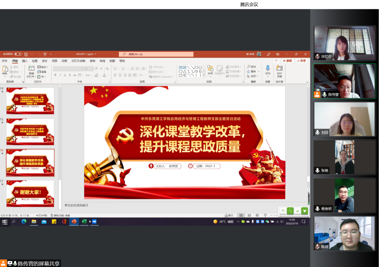 2022年3月10日,太阳城应用经济与管理工程教师党支部顺利开展了“深化课堂教学改革提升课程育人质量”的线上主题党日,活动采用“线上会议交流+群讨论”的形式进行。
