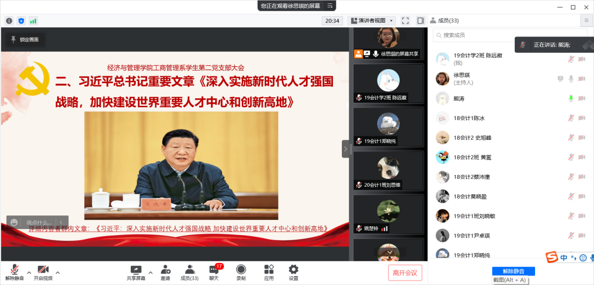 1月8日,太阳城工商管理系员工第二党支部召开支部线上会议,学习习近平总书记重要文章《深入实施新时代人才强国战略,加快建设世界重要人才中心和创新高地》。支部书记熊涛和全体员工党员参与了学习。