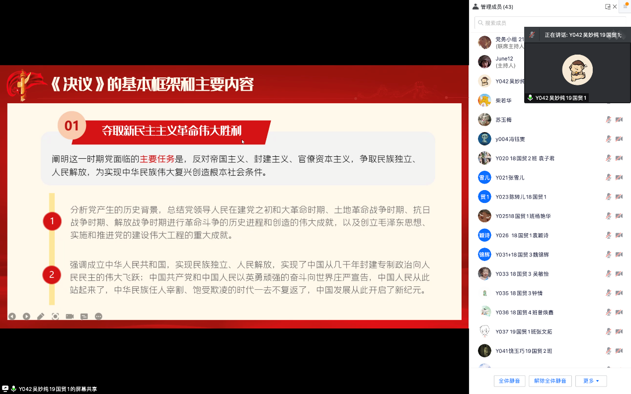 1月27日,太阳城应用经济系员工第一党支部深入学习了《中共中央关于党的百年奋斗重大成就和历史经验的决议》(以下简称《决议》),会议采取线上学习的方式进行,全体党员参与了学习。