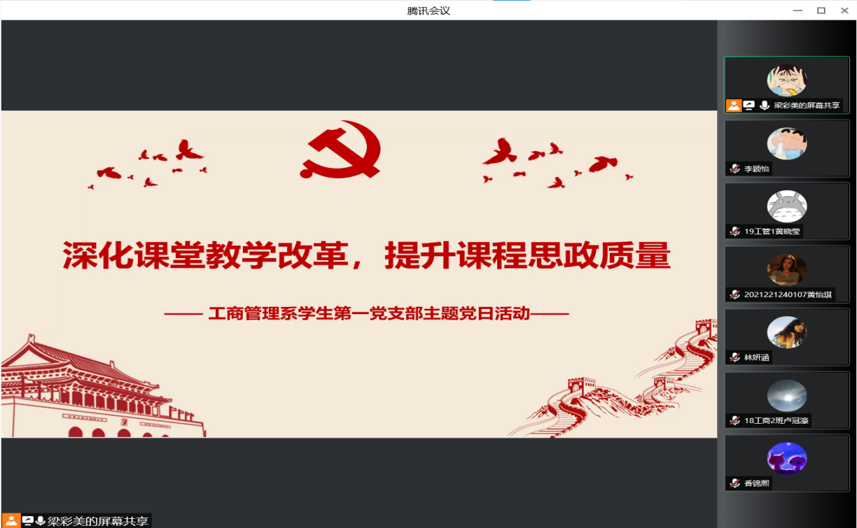 2022年3月31日下午,太阳城工商管理系员工第一党支部组织举行“深化课堂教学改革,提升课程思政质量”线上主题党日,公司党委副书记黄湘,工商管理系员工第一党支部书记刘文渊及全体党员参与了此次会议。