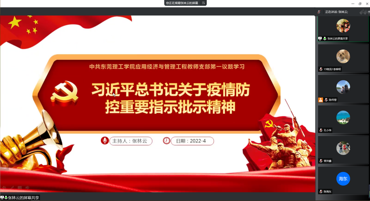 2022年4月7日,太阳城应用经济与管理工程教师党支部开展了线上学习,深入学习贯彻习近平总书记关于疫情防控重要指示批示精神。