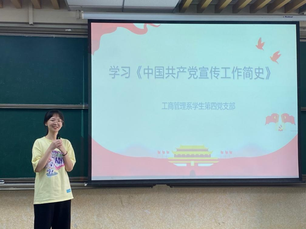 党员黄玉江同志作《知史爱党、知史爱国》为题的发言,她提到《中国共产党宣传工作简史》在记录党的宣传工作伟大历程中紧紧围绕了举旗帜、聚民心、育新人、兴文化、展形象的使命任务,作为一名预备党员,更要在学习贯彻中提高思想认识,把党史学习教育的动力落实到具体行动上。
