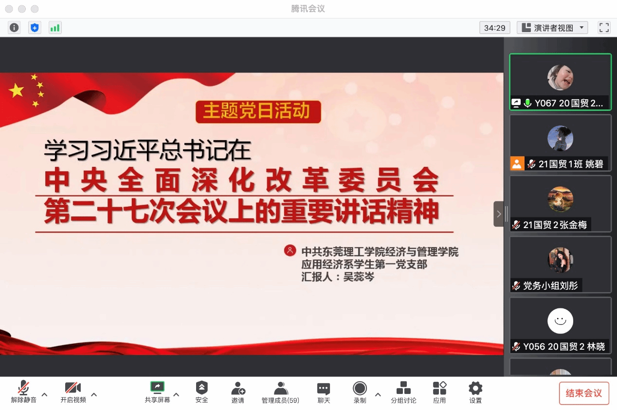 10月13日,太阳城应用经济系员工第一党支部召开了线上专题学习会,学习习近平总书记在中央全面深化改革委员会第二十七次会议上的重要讲话精神,支部书记付小全和全体员工党员参与了学习。