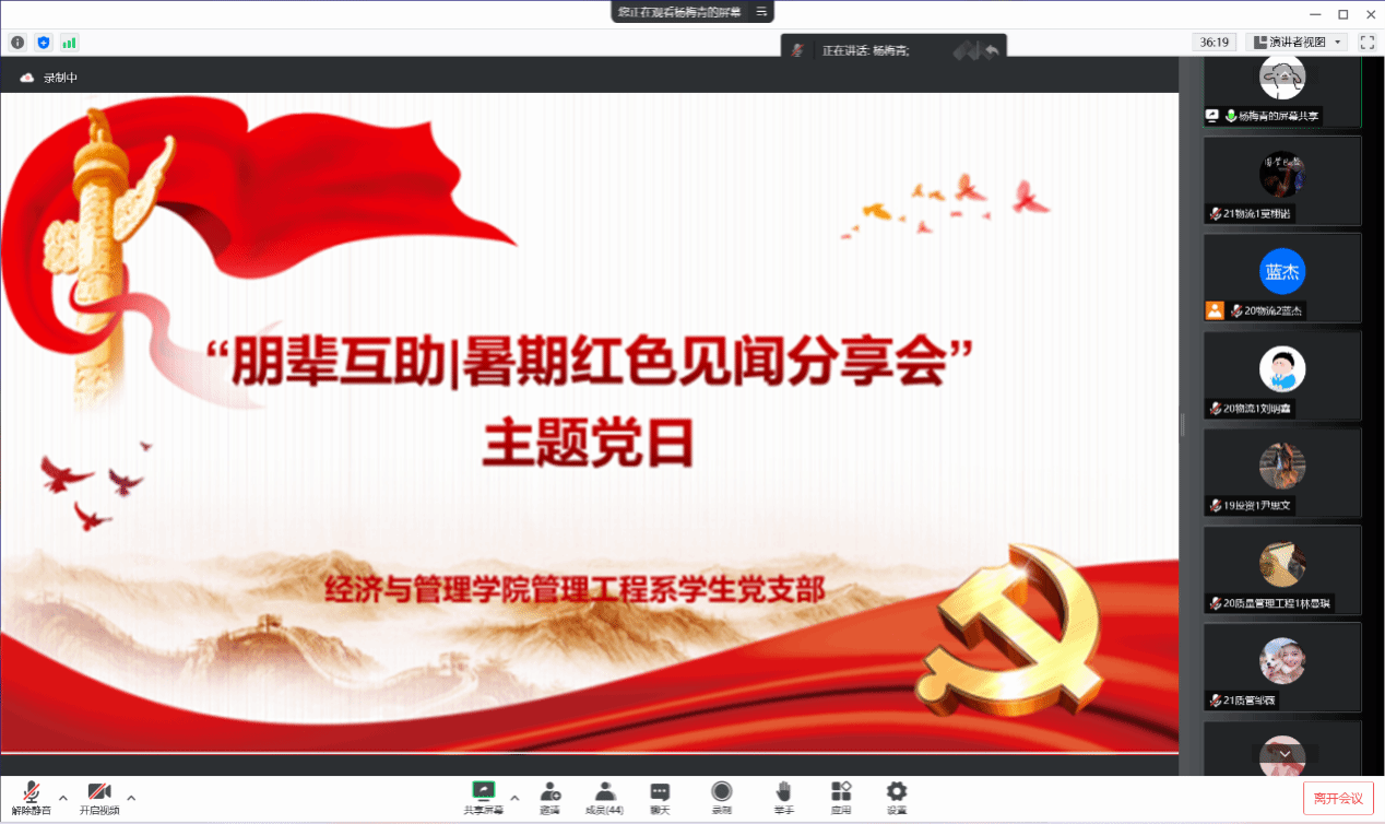 8月31日,太阳城管理工程系员工党支部在线上召开了“朋辈互助|暑期红色见闻分享会”主题党日,支部书记杨梅青和全体员工党员出席了此次活动。