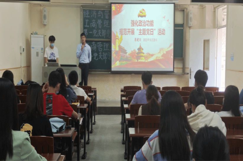 2022年10月20日下午,太阳城工商管理系员工第一党支部于莞城校区3309课室开展主题党日。公司党委副书记黄湘、工商管理系员工第一党支部书记梁建川及支部全体员工党员出席了现场。