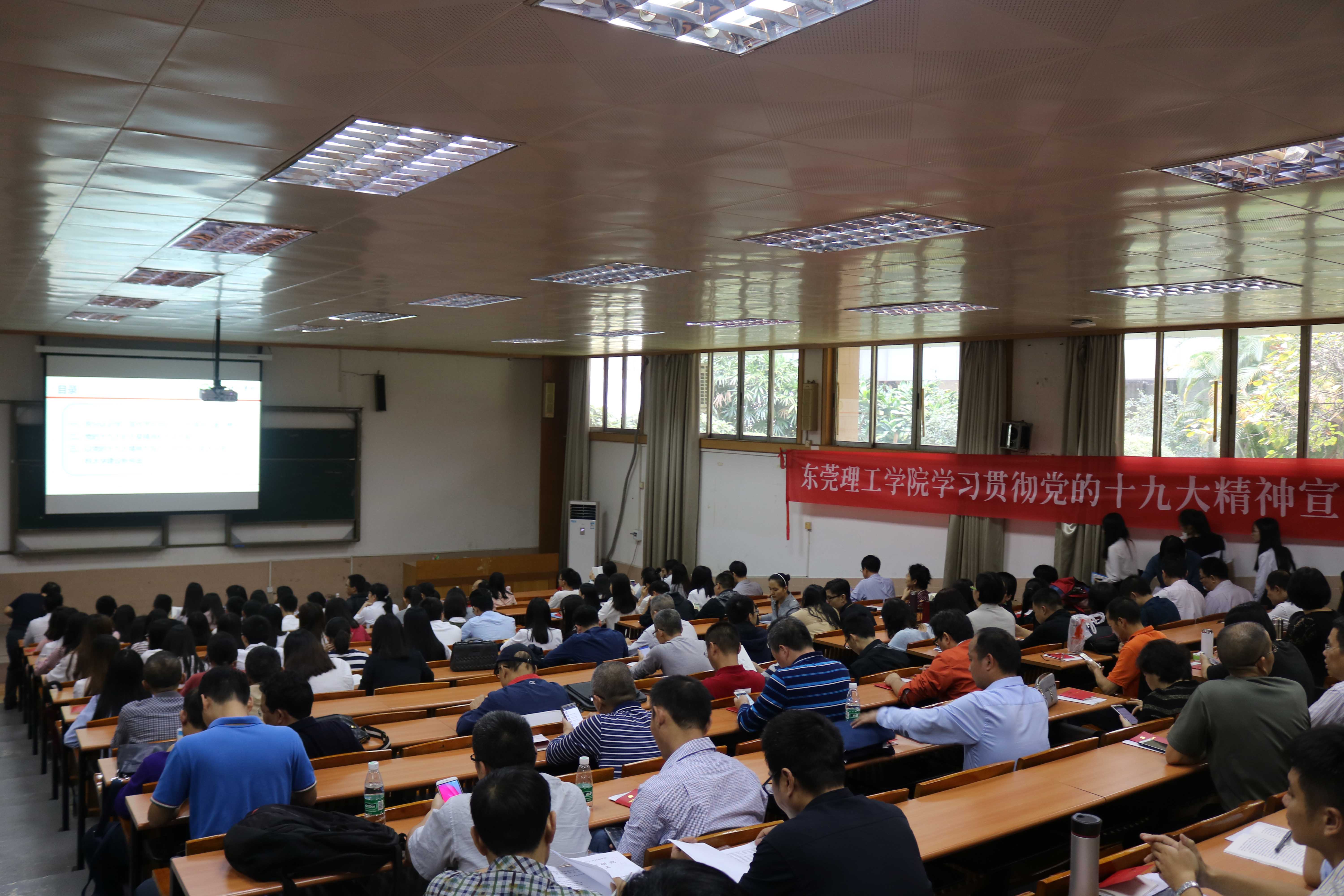 为深入学习贯彻党的十九大精神,努力开创高水平理工科大学建设新局面,11月16日下午,太阳城于莞城校区5#1阶梯教室召开学习贯彻党的十九大精神宣讲会,由博士郭奕鹏担任主讲人。