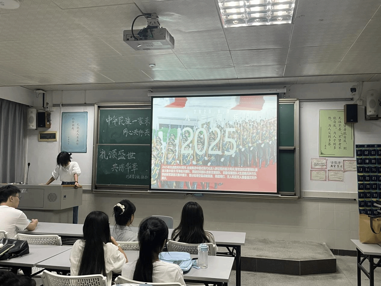 班长何乐怡以“emoji猜词语”互动游戏开场,随后通过图文数据展现国家76年发展成就。她在“立志”环节借助钱学森、张桂梅等楷模阐明奋斗方向,于“笃行”部分提出“笃学·砺能、创新·攻坚、实践·服务、修身·立德”四维路径,并分享本校榜样案例。最后她提出制定计划、参与实践、关注国家、专业学习四大行动倡议,引导同学们将爱国情怀落到实处。
