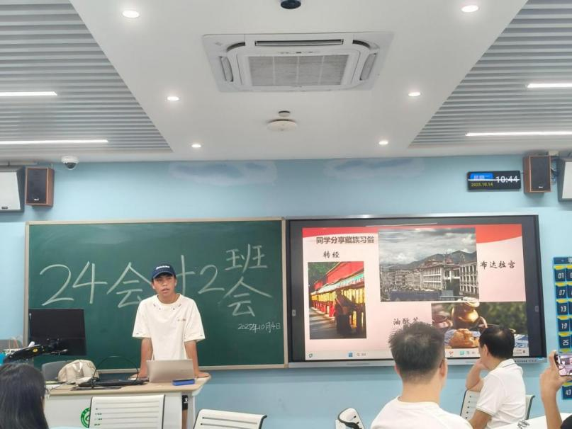 在民族团结篇章,文体委员万嘉怡系统介绍我国56个民族的风俗文化,藏族同学次仁顿珠围绕转经信仰、布达拉宫历史、酥油茶习俗作精彩分享,加深班级同学们对民族文化的认识。现场还设置“民族贴纸探寻”互动环节,同学们随机抽取哈萨克族、侗族、塔塔尔族等贴纸,通过“查资料—写寄语—贴拼图画”的方式,进行了一次 “行走的思政课”。