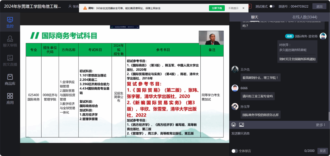 在随后的交流环节刘川副经理针对考生的疑问都进行了详细的解答,互动效果良好。此次线上直播宣讲会议的顺利开展,将助力公司更好地推进国际商务专业硕士员工的招生复试工作。