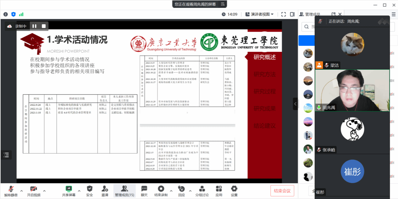 每一位研究生按照研究课题背景、研究问题、数据采集、模型建立、模型验证、析出结论等结构安排进行了毕业课题的PPT学术汇报。导师们初步肯定了员工们在学术研究上所投入的工作量,并在可优化及改进的地方提出了更详尽的方案意见。