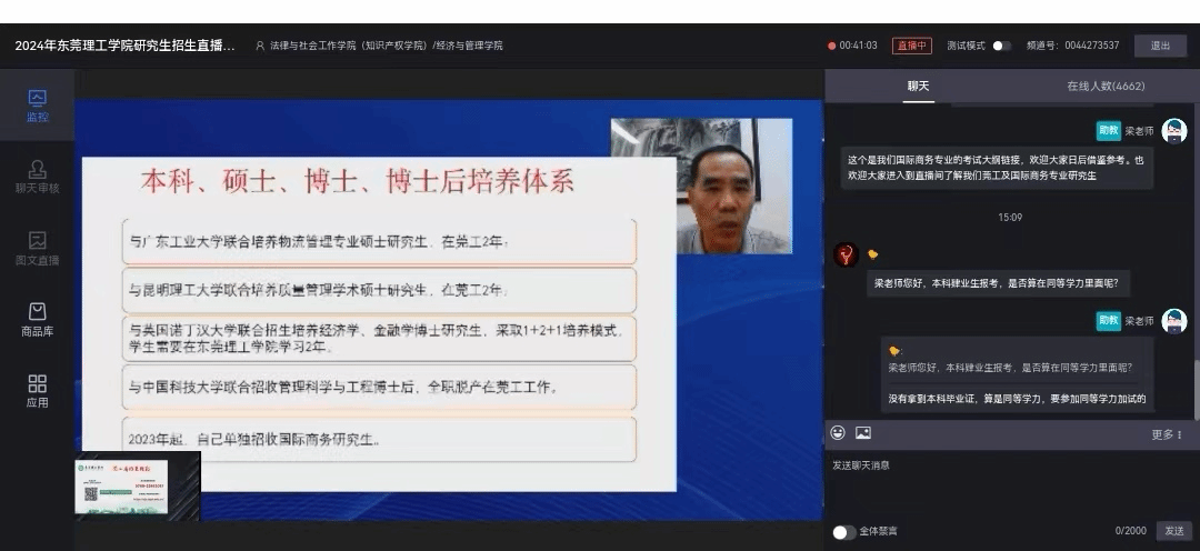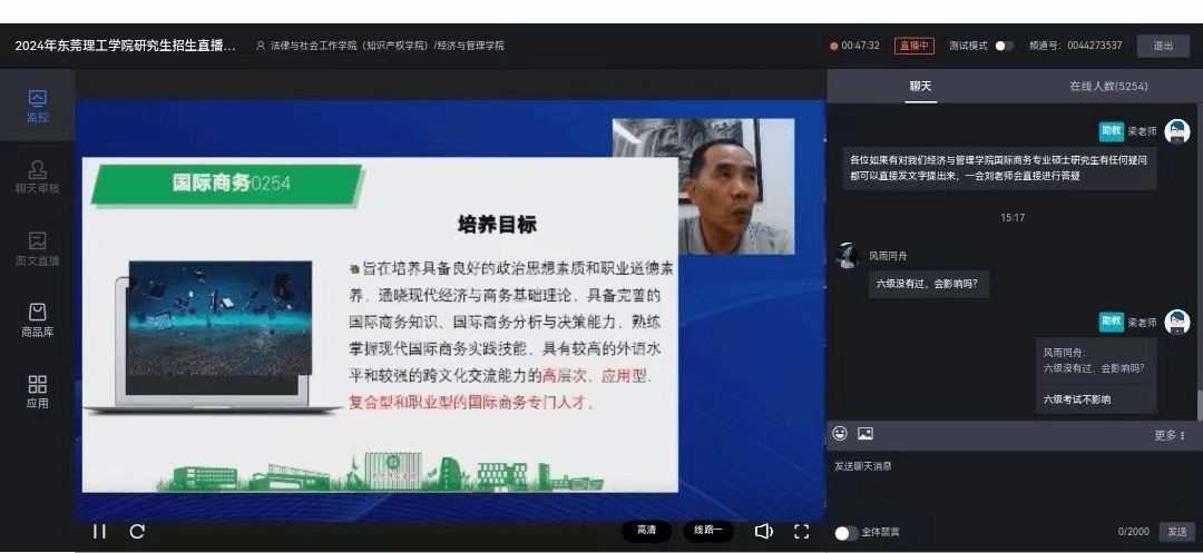 在随后的交流环节刘川副经理针对观众的疑问都进行了详细的解答,互动效果良好。此次线上直播宣讲会议的顺利开展,将进一步助力公司更好地推进国际商务专业硕士员工的招生工作。