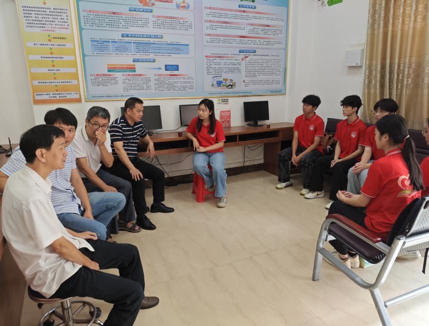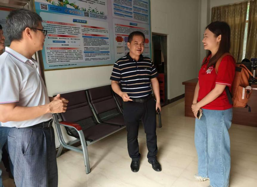 7月8日上午,队员在驿站发放资料、解答咨询,茂名市茂南区教育局张勇书记亲临指导,肯定其工作并建议结合教育资源让政策宣传更接地气,队员认真领会。下午,活动分两队进行,一队由梁雅俐老师带队入户讲解政策、倾听需求,另一队留守驿站持续服务。活动尾声,全体队员与张勇书记合影并总结,通过 “驿站 + 入户” 模式扩大宣传广度、加深群众联系。队员表示将坚守初心,让惠民政策走进千家万户。